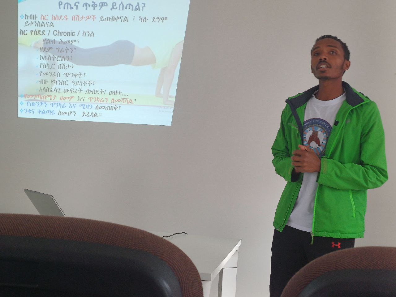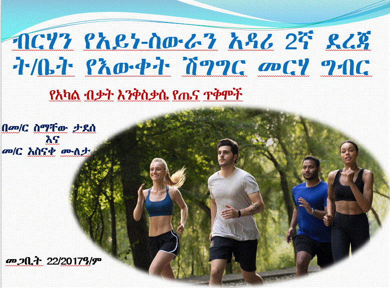 በመረሓ ግብሩ ላይ በት/ት ቤቱ ጤ.ሰ.ማ ት/ክፍል አስተባበሪነት የተዘገጀዉን በት/ቤቱ የጤ.ሰ.ማ ትምህርት መምህር የሆኑት መ/ር ስማቸዉ ታደሰ ‘የአካል ብቃት እንቅስቃሴ የጤና ጥቅሞች’